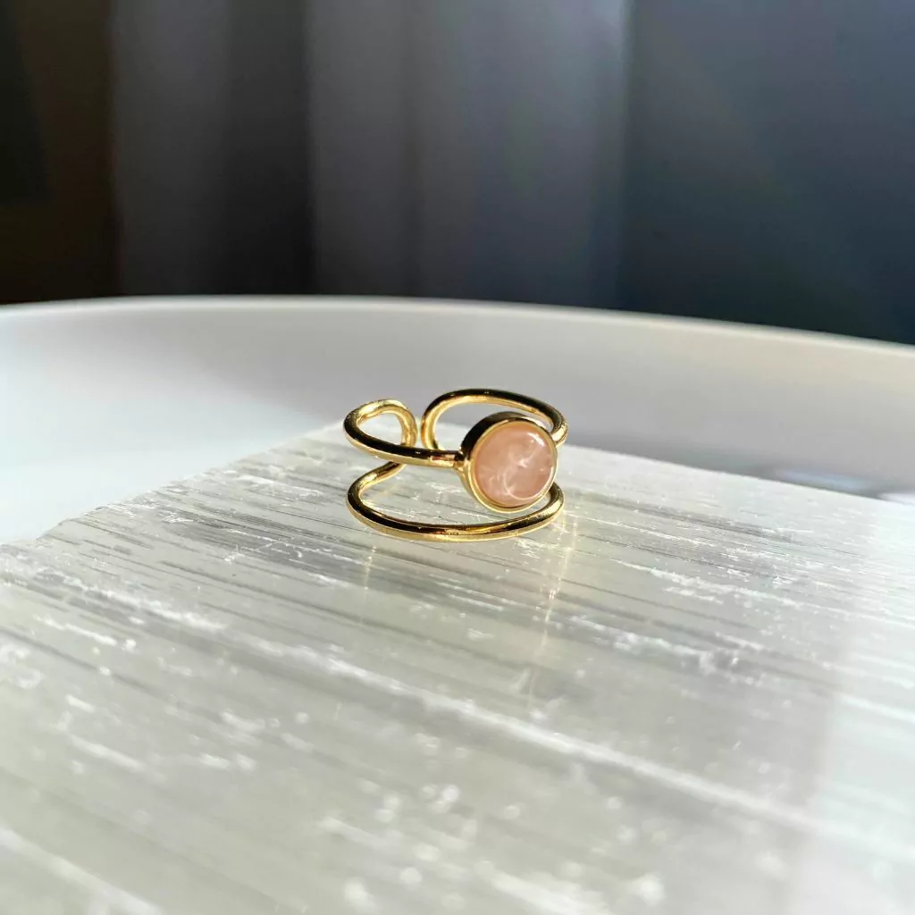 Anel folheado a ouro, com pedra natural redonda de quartzo rosa de 6,5 mm e dois aros.