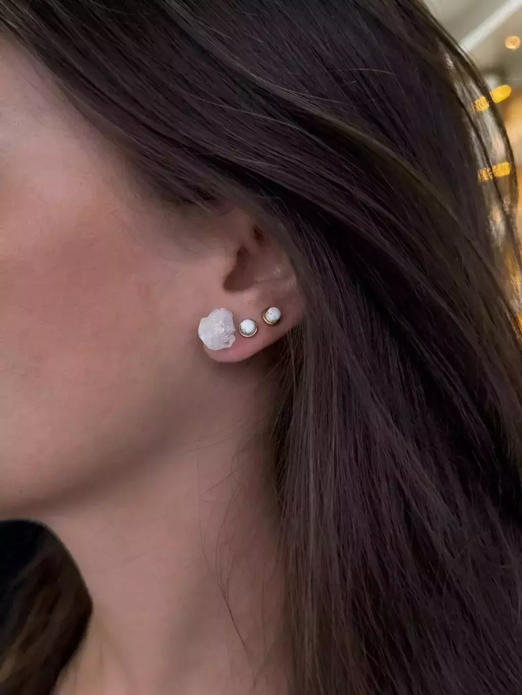 Brinco circular com pedra natural de drusa de cristal.